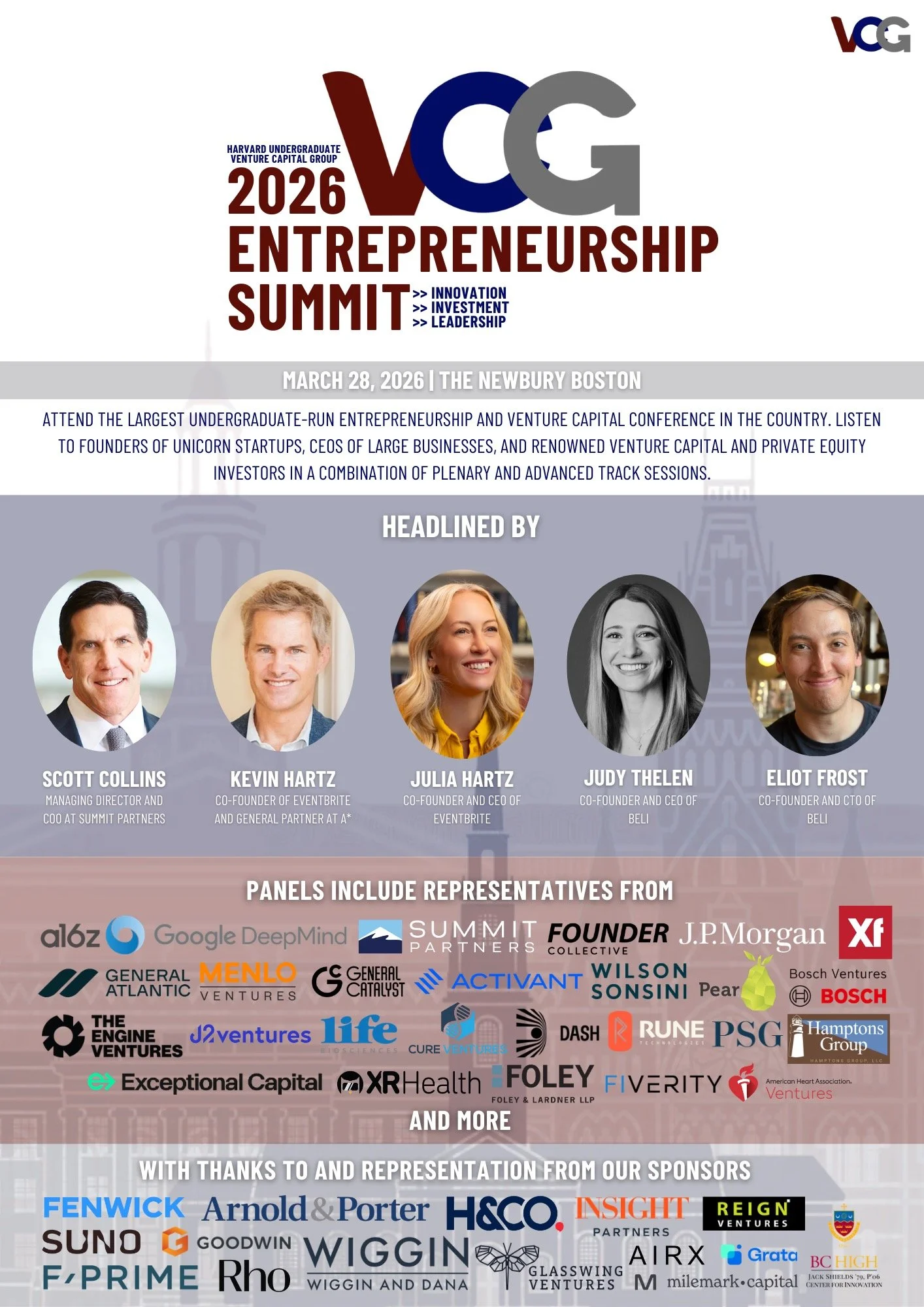 Centered upon three themes of Innovation, Investment, and Leadership, VCG’s Entrepreneurship Summit aims to inspire students, investors, and entrepreneurs to pursue their entrepreneurial passions in building and leading startups and investment firms.